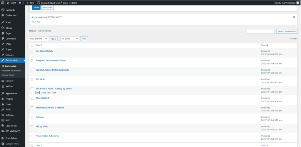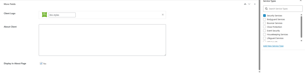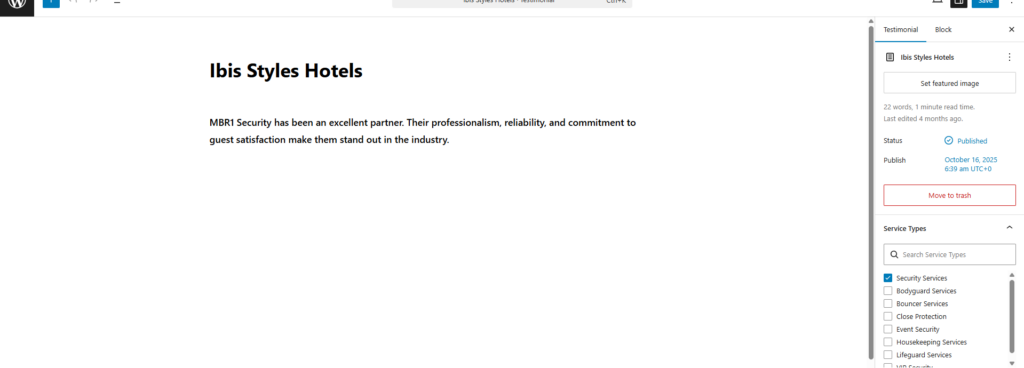 The Testimonial shown on the About page and the testimonial related to each service type are selected in the testimonial section shown below